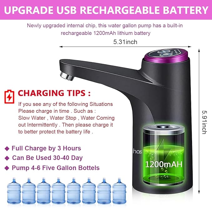 - [EASY TO USE]: Too heavy to lift and flip the water bottle onto the dispense machine? With this elegant water bottle pump, you can enjoy refreshing water by simple installation and touching the switch. No lifting or flipping anymore when you want to replace a new water bottle. The automatic water dispenser is easy to operate and save your time. Notice: Please charge water pump dispenser in time to avoid insufficient water outlet caused by power short.
